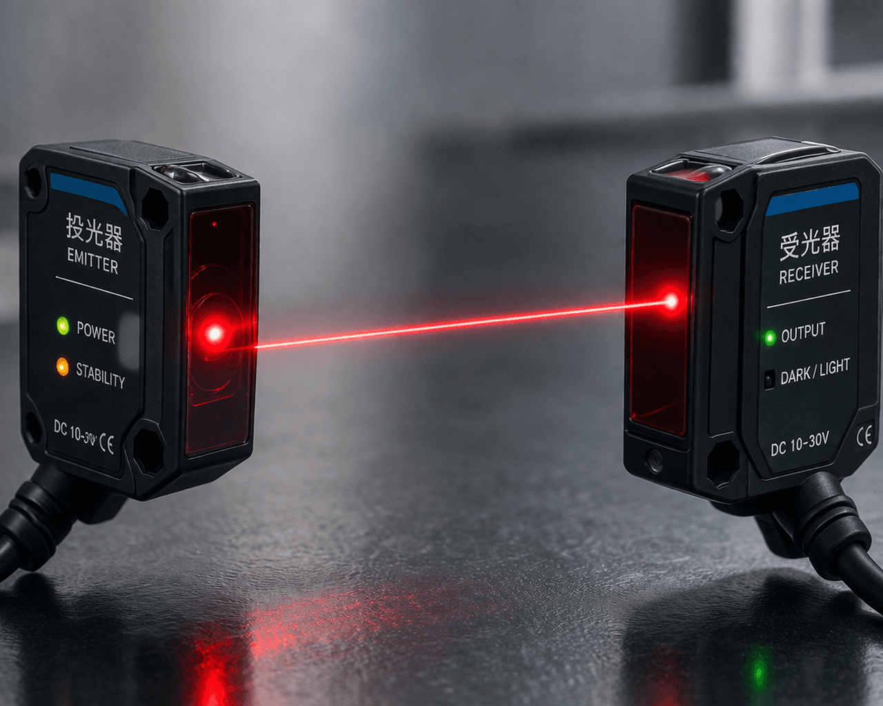 投光部と受光部の間を物体が遮ることで検出する非接触式のセンサです。透過型・反射型・回帰反射型などの種類があります。